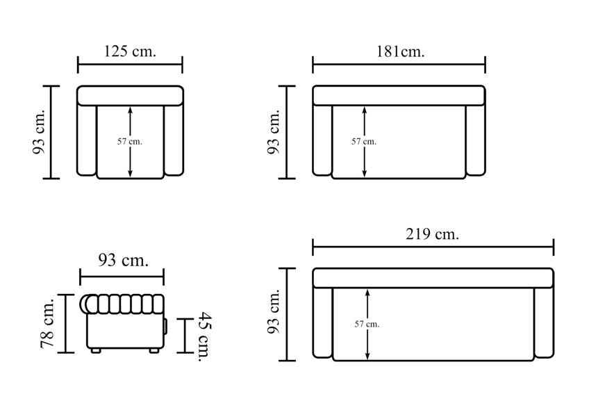 - Die Möbelstücke dieser Garnitur haben folgende Gewichte: Das 3er Sofa wiegt 69 kg, das 2er Sofa 61 kg und der Sessel 39 kg! Also absolut langlebige massive Möbel.