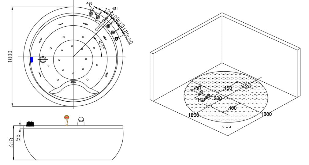 - 21 mittlere Massagedüsen Wassermassagedüsen sorgen für Entspannung rund um. Die Düsen sind rundum ergonomisch im Rücken und Beinbereich angeordnet.