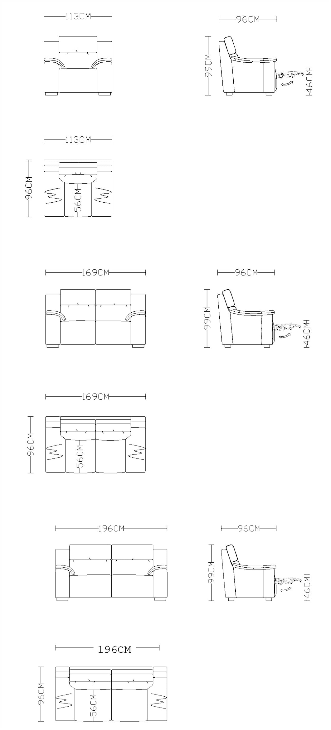 - Bestehend aus einem 3er Sofa, einem 2er Sofa und einem Sessel mit je einem elektronischen Recliner.