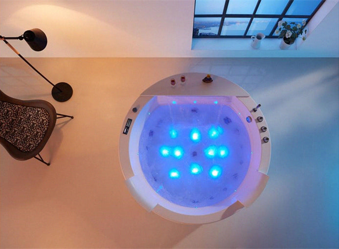 Die Farblichttherapie-LEDs befinden sich an der Seite, im Boden und am edlen großem Wasserfall. Durch ein integriertes Radio und dem CD-Anschluss können Sie beim Baden Ihre Lieblingsmusik hören. Über das digitale Computerbedienelement regulieren Sie kinderleicht die Heizungstemperatur, um diese auf einem konstanten Level bleiben zu lassen. Weitere Funktionen wie die Wasserpumpe, Luftpumpe und die Ozonreinigung der Whirlwanne etc. werden ebenfalls über das Computerpanel gesteuert.